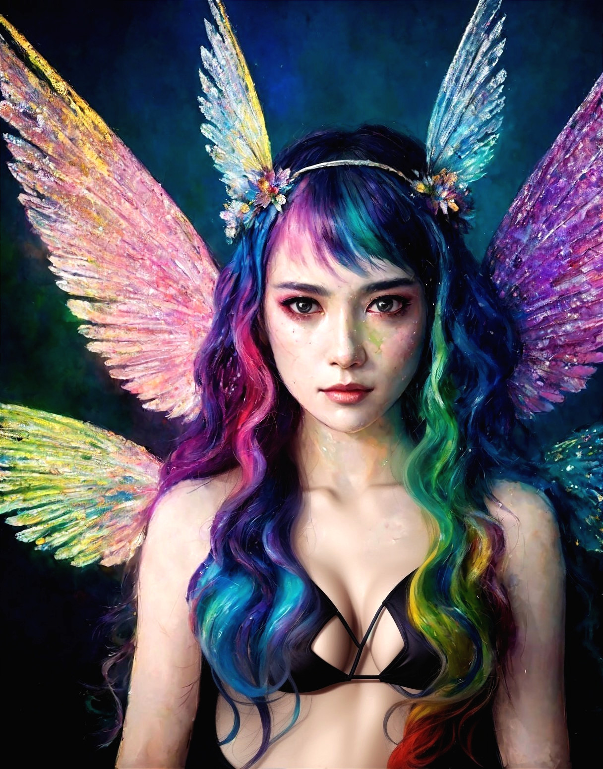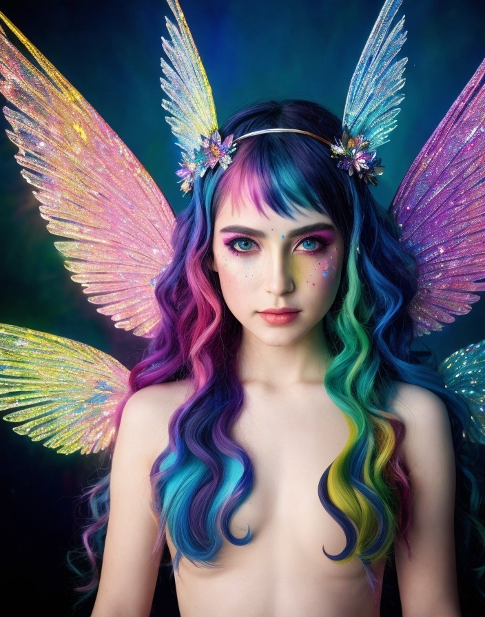 A vibrant artwork of a person with rainbow-colored hair, butterfly wings, and a floral crown against a dark backdrop.