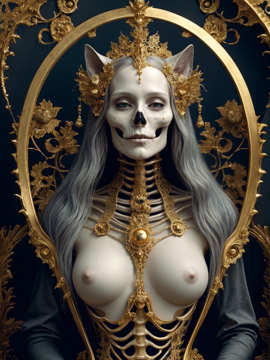 portrait in the style of Albrecht Durer and Hieronymus Bosch, ,skeleton like bones, ethereal beauty, cat face,  intricate porcelain features, intricate gold accents, mesmerizing fractal designs, hauntingly elegant, dark aesthetic, emotional depth, insanity-themed, dramatic portrayal, evil and despair elements, fairytale creatures, fantasy realm, detailed fantasy art, digital illustration, high-resolution, dark color palette with hints of gold, purple, and black, mystical lighting,