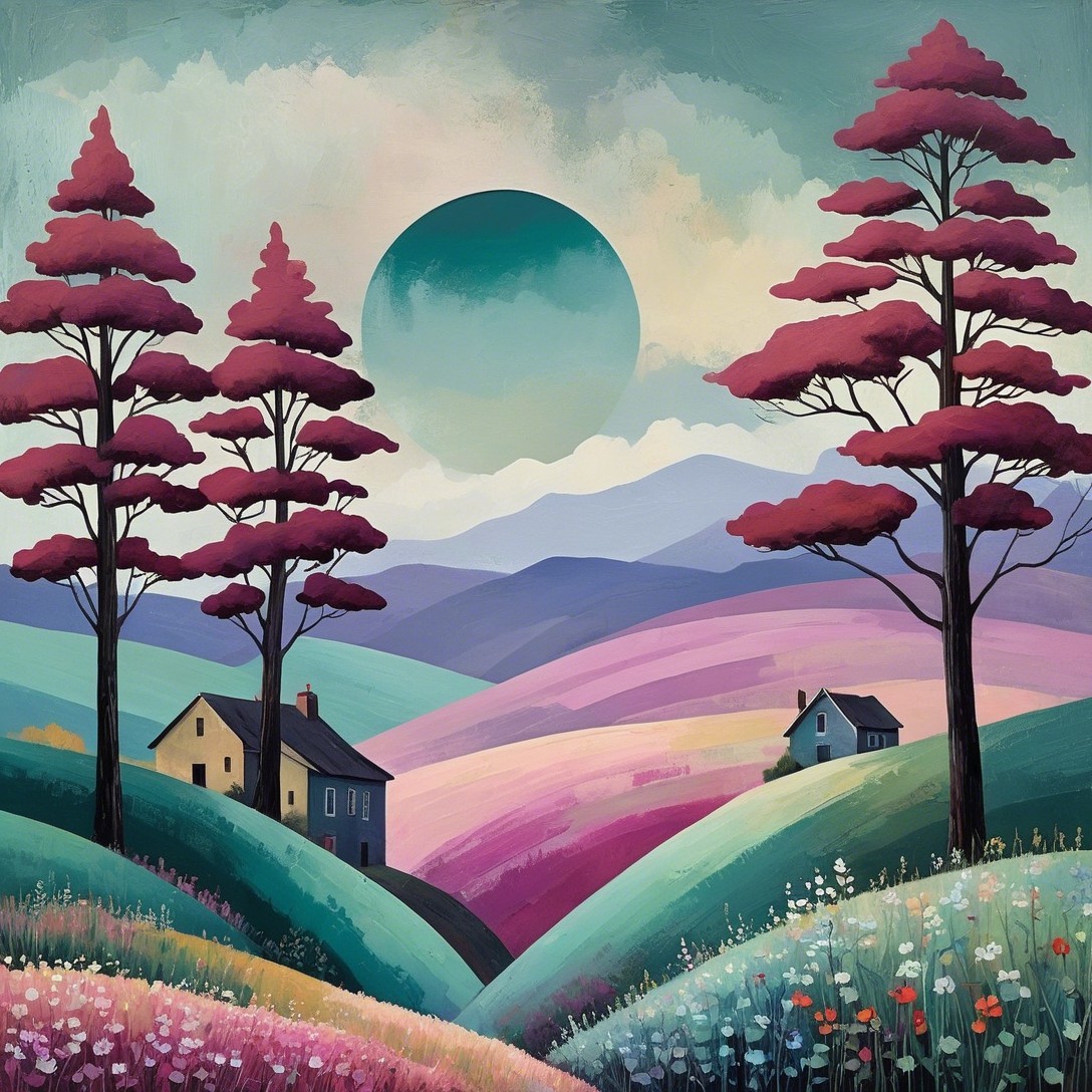 A vibrant landscape features rolling hills in shades of pink, green, and purple, framed by tall, red trees under a large, muted moon. Flowers dot the foreground, creating a serene atmosphere.