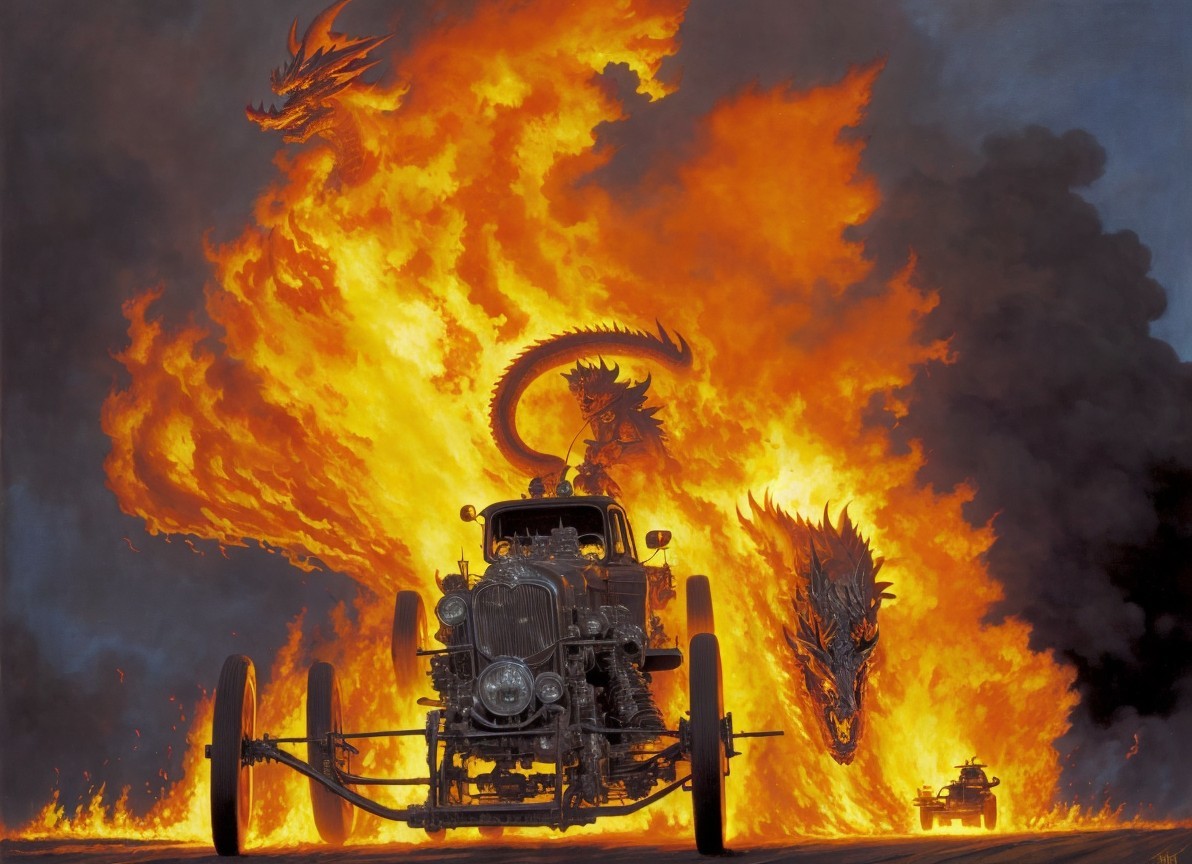 + Prompt:death defying daredevil dragon riders brave the flames as they attempt to survive a fire breathing torque tearing gasoline burning spine ripping monster death machine dragon drag-racing
