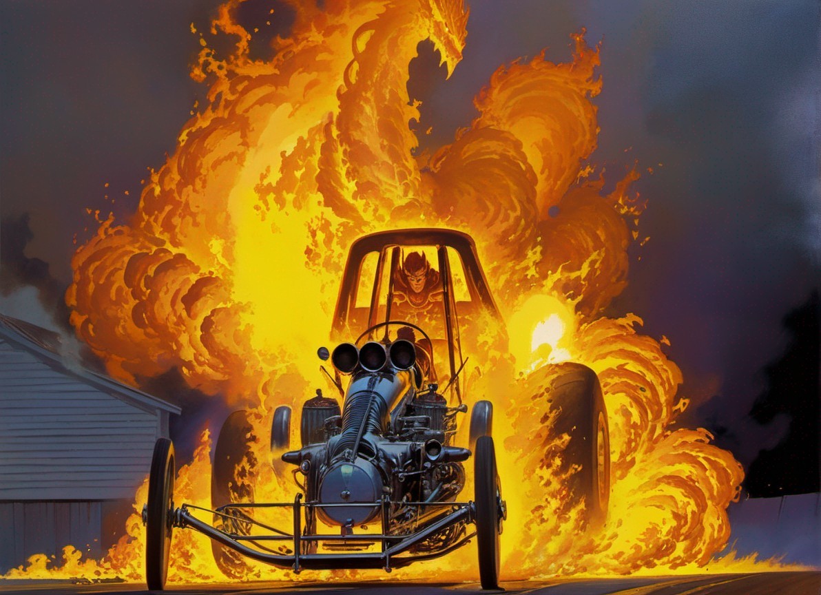 Prompt: death defying daredevil dragon riders brave the flames as they attempt to survive a fire breathing torque tearing gasoline burning spine ripping monster death machine dragon drag-racing - hot on your heels - for in speed we dwelt, thrusting forward through perpetual darkness, we worship a thunderbolt, made by man in the fumes of gasoline