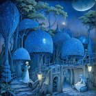 A serene, icy landscape features towering cliffs and cascading waterfalls illuminated by a bright moon. Two figures stand on rocky ledges, surrounded by snow-covered trees in a tranquil blue hue.