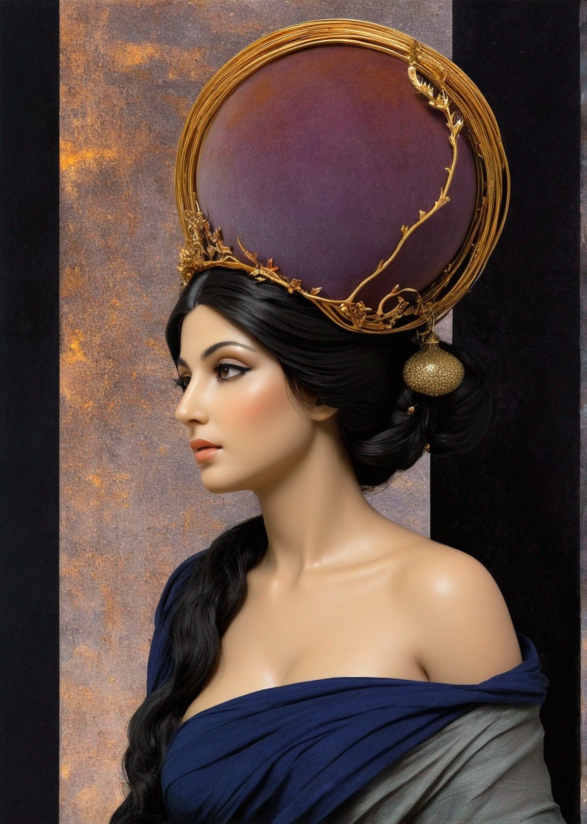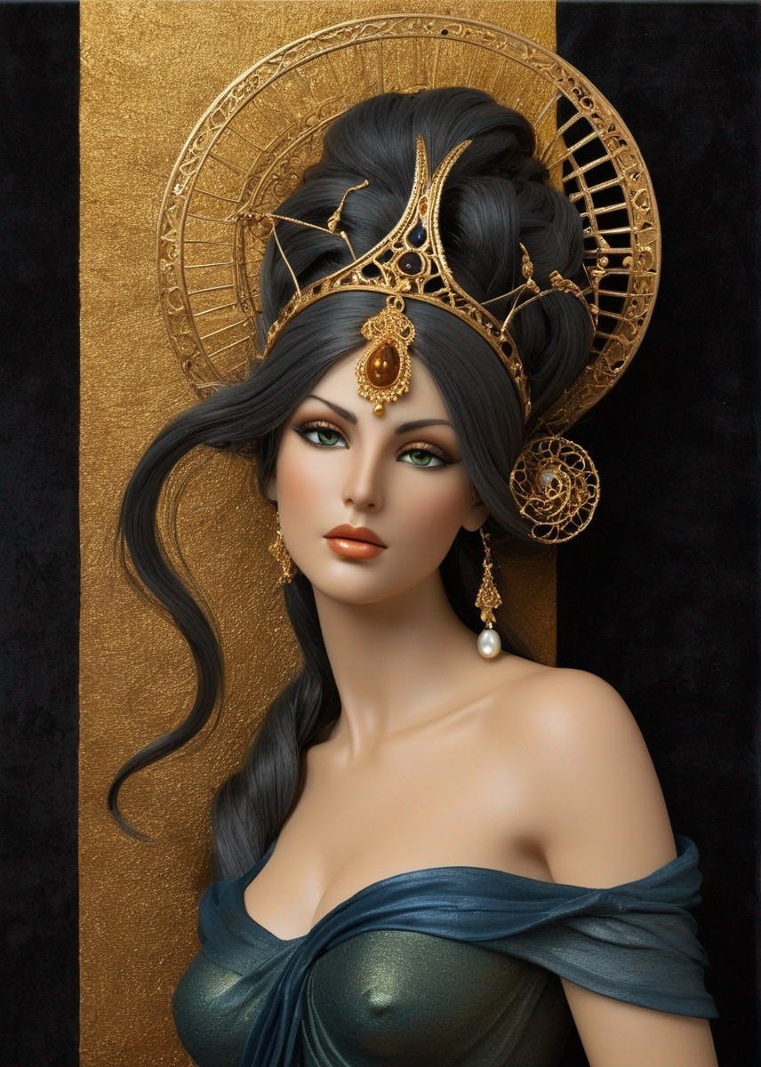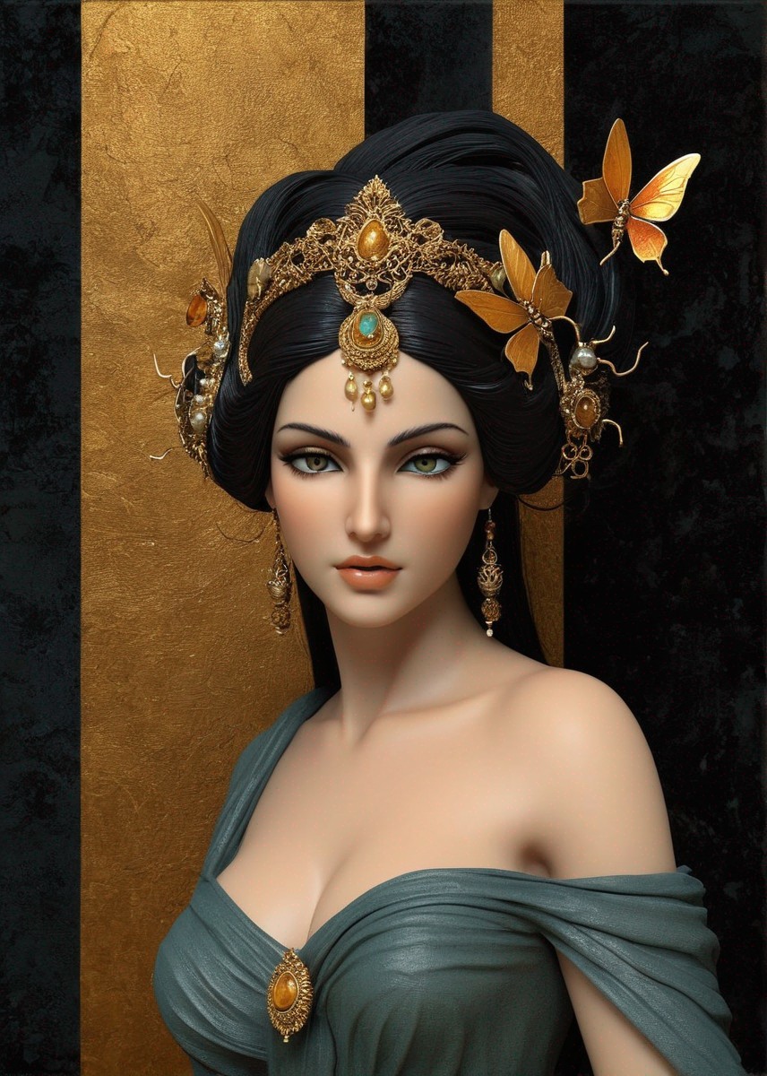 Nymph of the night is dark and full of beautiful magic. She oÀis Chaos, she stirs the hornet's nest.. 3rd century Persian miniature art, golden ochre, sage green, pearl grey, paprika, blue-grey, Velvet Black, Shabby, Dull Gold, Amber Gray, Golden Ratio, Surreal Fantasy, Elegant, High Definition Ultra Fine 3D Line, Zenangle Style, Watercolor Patchwork , Arthur Rackham Style, Paul Kidby, , Jacek yerka, Extremely Detailed, Intricate, Thoughtful, HDR, Fractal, Beautiful, Award Winning, Fantasy Look, Fantasy, Crisp Quality