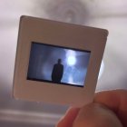 A hand holds a small photo frame depicting a silhouetted figure against a glowing circle, surrounded by soft clouds and ethereal light, creating a surreal and contemplative atmosphere.