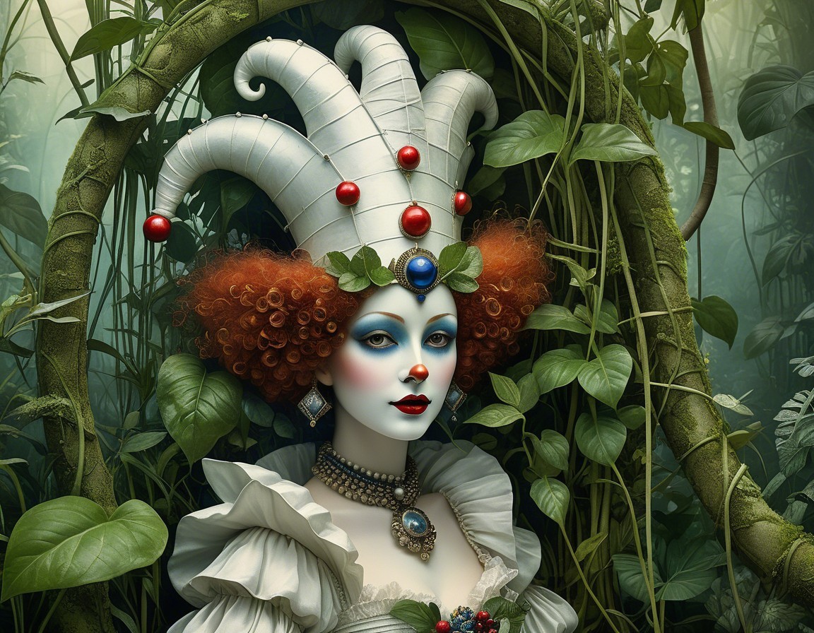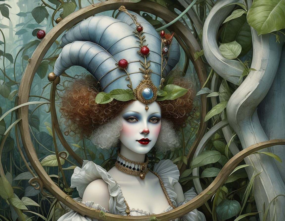 A whimsical portrait of a woman with curly hair and a regal crown, surrounded by lush foliage and colorful butterflies. A cat peers through the plants, adding an enchanting touch.