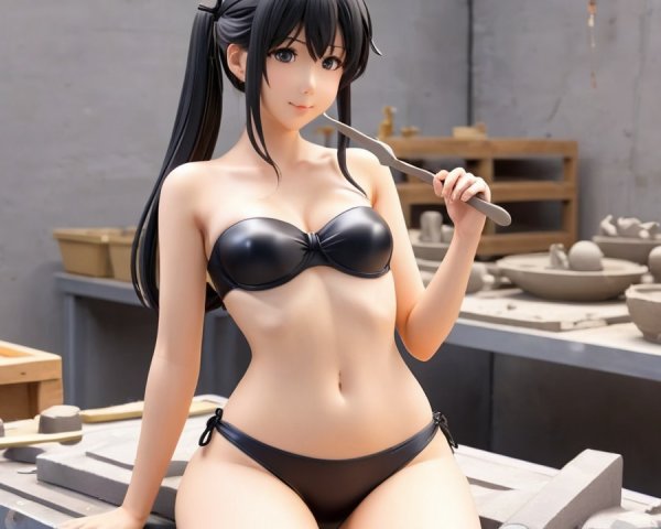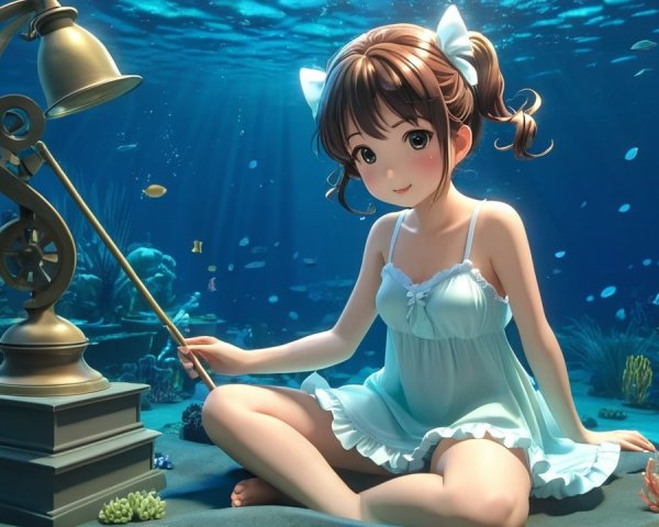 A charming anime girl sports a playful corn-themed swimsuit, featuring vibrant yellow and green hues. Her cheerful expression and lively pose capture the essence of summer fun and whimsy.