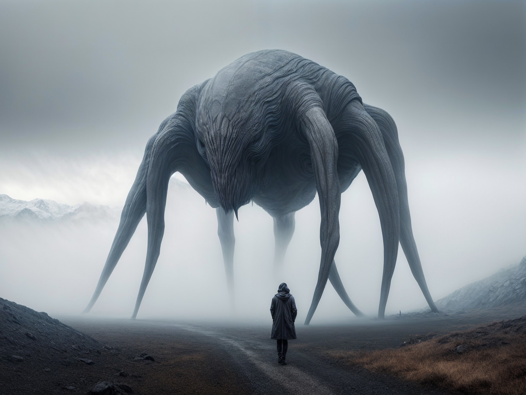 Prompt: "giant something creature, photography in the style of detailed hyperrealism, stylish, dark, full-body photography, valley, foggy, shrouded in fog, mountains, soft light, futurism, Louise Bourgeois, Anish Kapoor, expressive, hyper detailed, intricate, artstation, dof, original phenomenal masterwork with virtuoso details"
