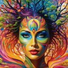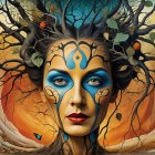 A striking portrait of a woman with intricate blue and orange face paint, resembling tree branches and leaves. The background transitions from warm autumn hues to a serene blue sky.