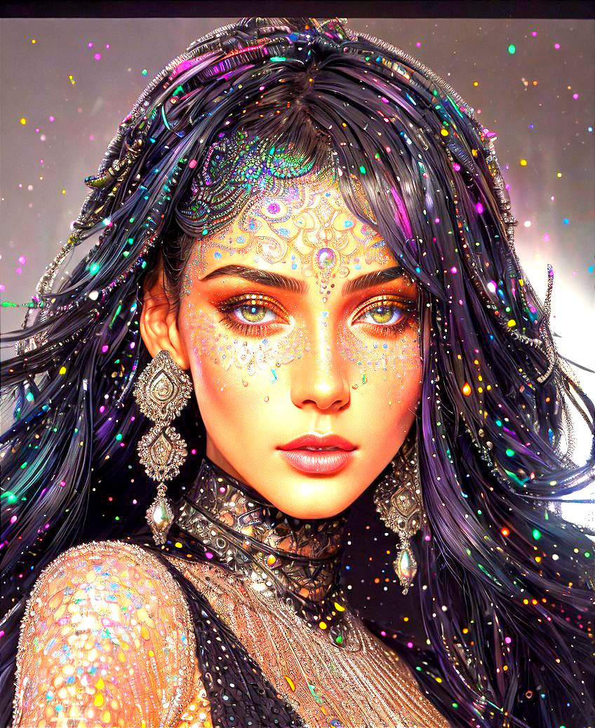Portraiture, metallic colors, pointilism, hues, plasticity 1.6, 3d effects 1.8, tints of blade runner, female face, intricate skin texture, sweat, stylized illustration 1.8, vaporous, fauvism, encaustic, beautiful female head, intricate details, vibrant colors, high detail, muted colors in background
