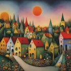 Covered Mountains in snow, starry night, curved street, snow on the roofs, styles of Paul Klee Dee Nickerson and Tim Burton