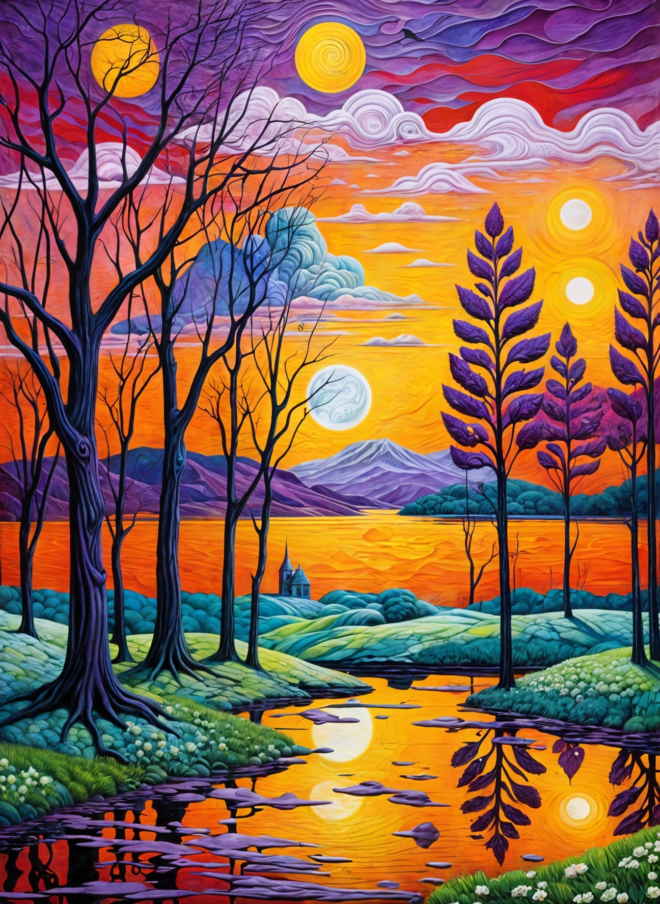 A vibrant sunset landscape features colorful trees, a tranquil river reflecting a full moon, and whimsical swirling clouds. The scene is rich in hues of orange, purple, and blue, creating a dreamy ambiance.