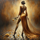 A woman in a flowing yellow dress walks past a quaint house amid a forest of autumn leaves.