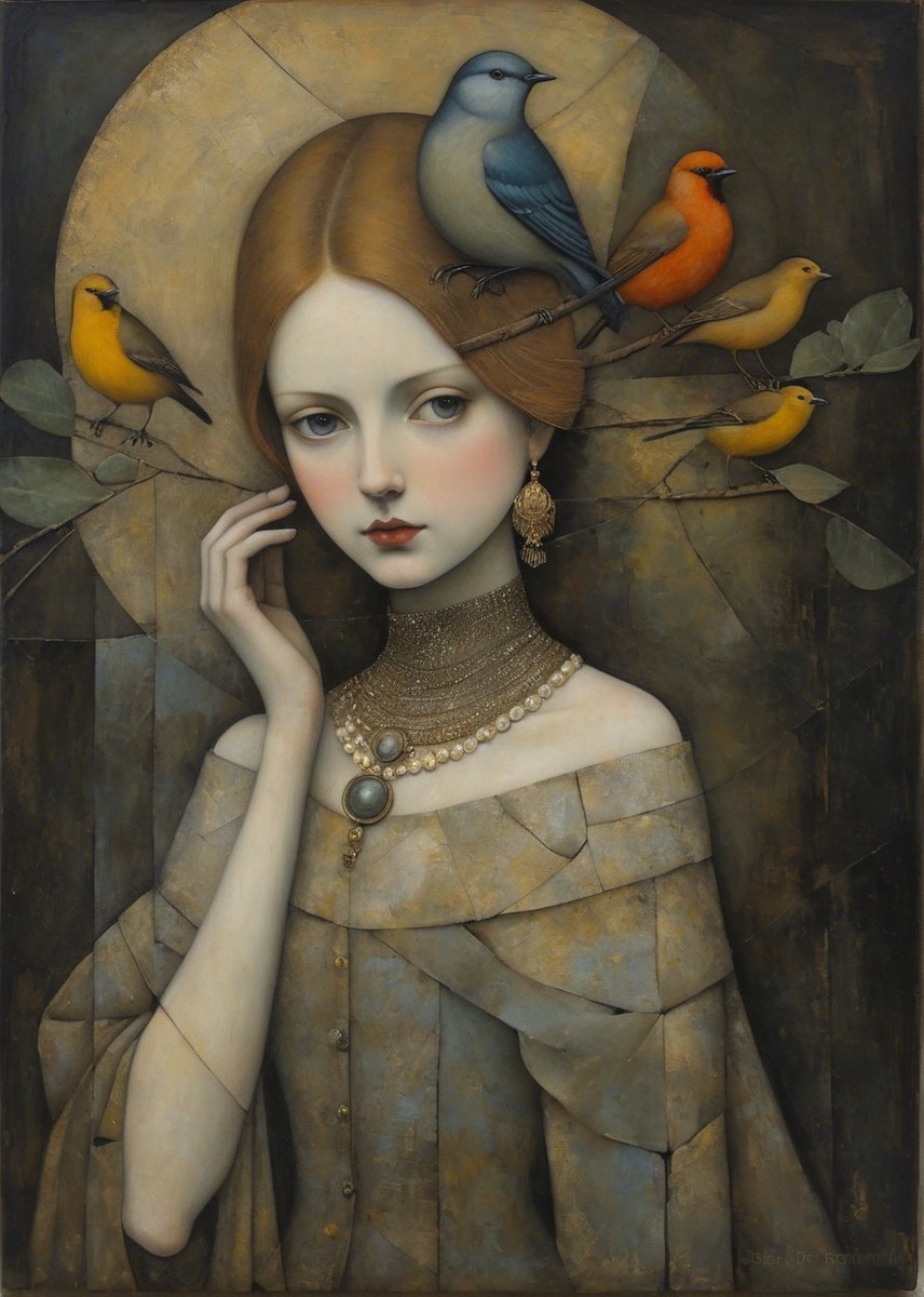 A serene portrait of a woman with striking red hair, adorned in elegant jewelry. She gently poses, surrounded by colorful birds perched on her shoulder and head, set against a golden halo.