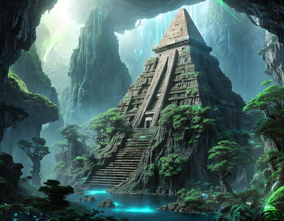Prompt: "Ancient alien civilization with highly advanced technology seamlessly integrated with their surroundings. Bioluminescent menagerie pyramid assimilated with advanced alien technology. Ambient occlusion, Dynamic landscape with Alien jungle, huge cliffs filled with vines on either side, long stairways, deep ravines and valleys with raging rivers and waterfalls. A large portal for time traveling opens above the pyramid. Astral realm, cosmic DMT pyramid, extraterrestrial UFO in front of surreal bioluminescent mushrooms and colossal crystals. Picture magical energies, surrounded by symbols like sacred geometry, mystical occult imagery (hamsa, eye of providence), talismans, esoteric tarot cards, and the all-seeing eye. Embrace the beauty of a fantasy landscape under a cosmic sky In the style of Cameron Gray. psychedelic elements like hallucinogenic DMT vibes, shamanic LSD art, and the ethereal DMT realm"