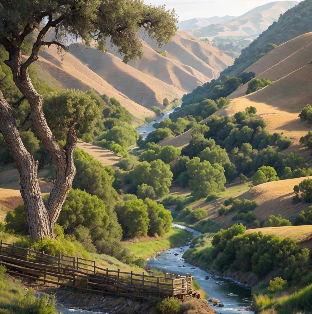 Prompt: "A few miles south of Soledad, the Salinas River drops in close to the hillside bank and runs deep and green . . . On one side of the river the golden foothill slopes curve up to the strong and rocky Gabilan mountains, but on the valley side the water is lined with trees—willows fresh and green with every spring . . . and sycamores with mottled, white, recumbent limbs and branches that arch over the pool . . . . There is a path through the willows and among the sycamores, a path beaten hard by boys coming down from the ranches to swim in the deep pool, and beaten hard by tramps who come wearily down from the highway in the evening to jungle-up near water. In front of the low horizontal limb of a giant sycamore there is an ash pile made by many fires; the limb is worn smooth by men who have sat on it."
