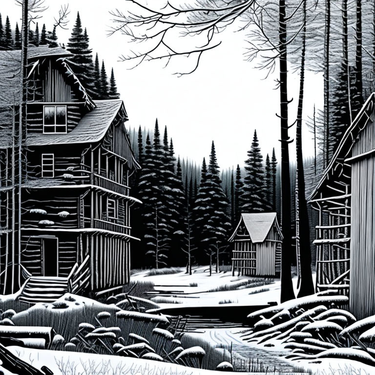 Serene winter scene with snow-covered cabins and coniferous trees