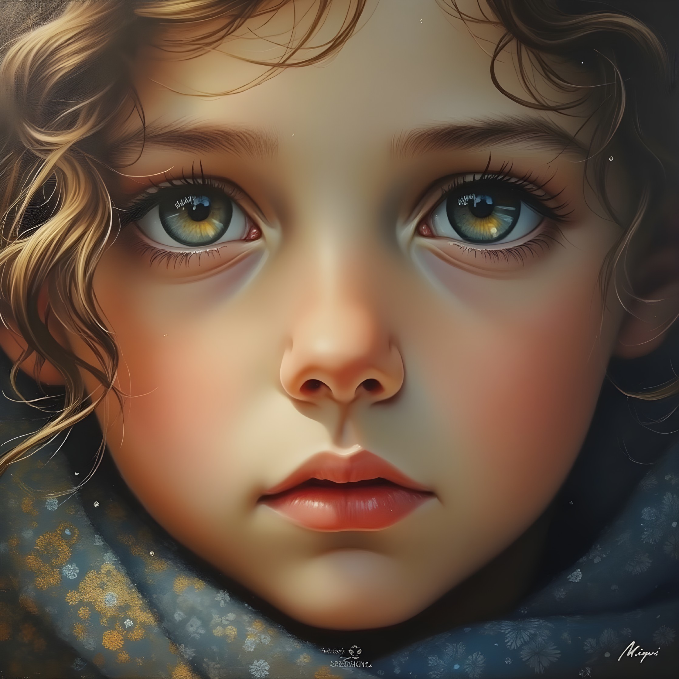 A close-up portrait of a young child with curly hair, large expressive eyes, and a soft, gentle expression. They are wrapped in a patterned scarf, with a dreamy background that adds warmth.