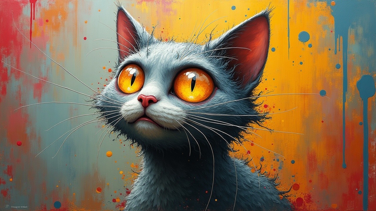 A whimsical, colorful portrait of a cat with large orange eyes, set against a vibrant, abstract background. The fur is textured, adding depth to the playful expression of the feline.