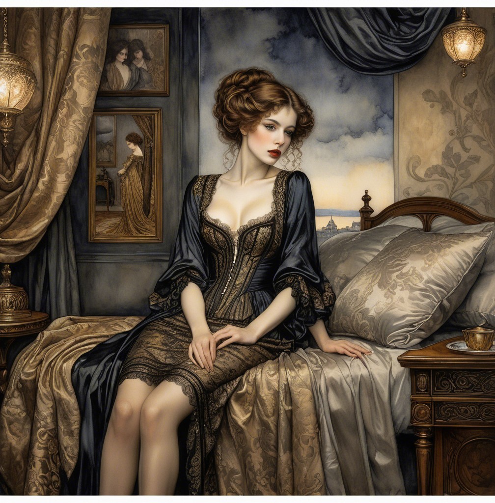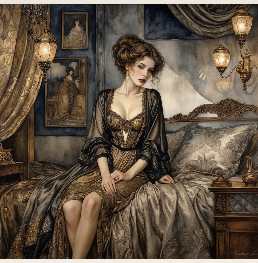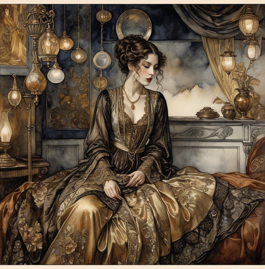 A graceful woman in an elegant blue gown with gold accents sits thoughtfully, surrounded by rich decor and soft lighting, her reflection visible in a nearby mirror.