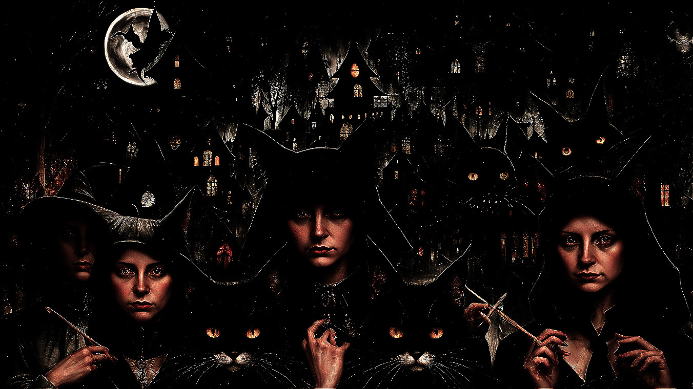 The image features a haunting scene with four women in dark cloaks, each accompanied by a large black cat. The backdrop shows a moonlit, eerie village with glowing windows, enhancing the mystical atmosphere.