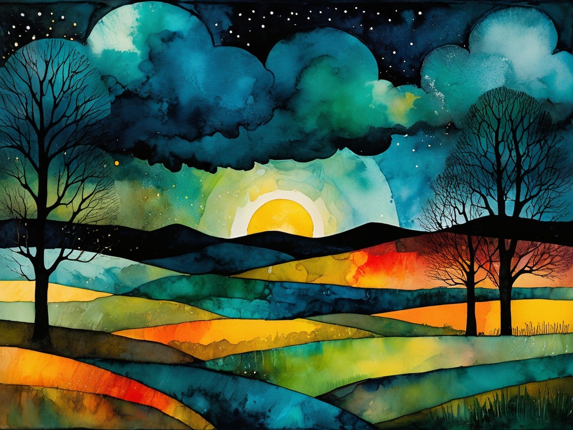 A vibrant watercolor landscape depicting rolling hills under a dramatic sky. Dark clouds contrast with a bright sunset, while silhouetted trees frame the scene, creating a serene, enchanting atmosphere.