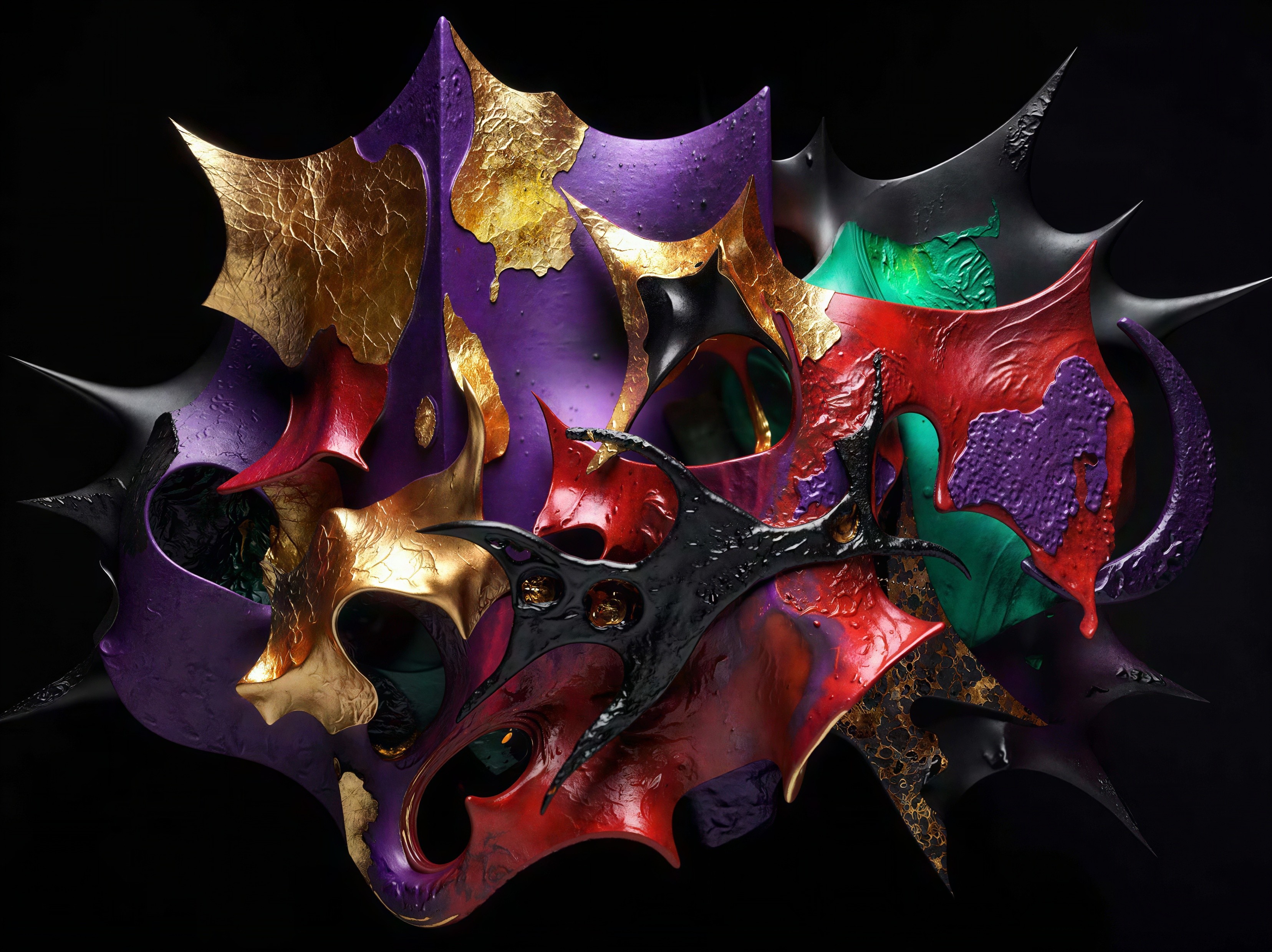 A hyperrealistic sculpture featuring a purple, gold, and red spiked mask with a black spider in the center, resting on a black background, in the style of abstract 3d art, with a combination of rough-textured paint and smooth sleek finishes, a detailed pattern of black floral motifs and a