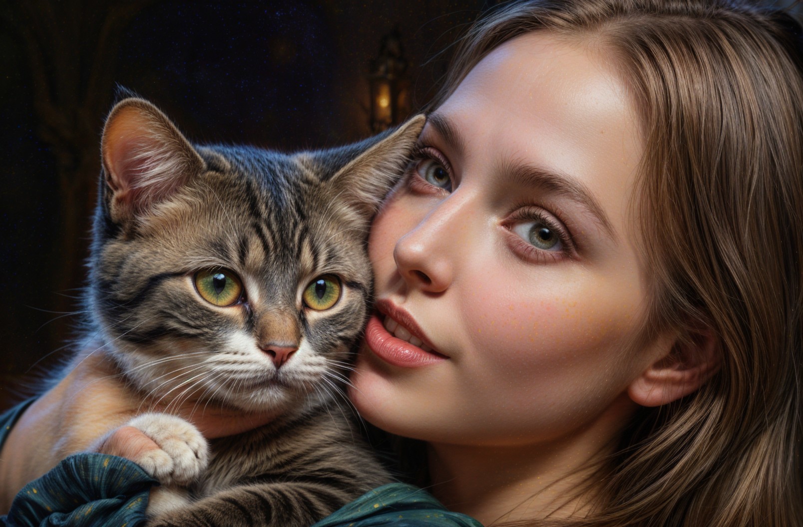 A young woman with long, flowing hair gazes softly while holding a fluffy cat close to her face, both sharing a serene moment. The background features warm, subtle lighting.