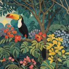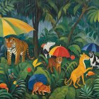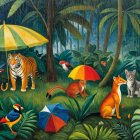 Vibrant Jungle Scene with Tigers and Colorful Birds