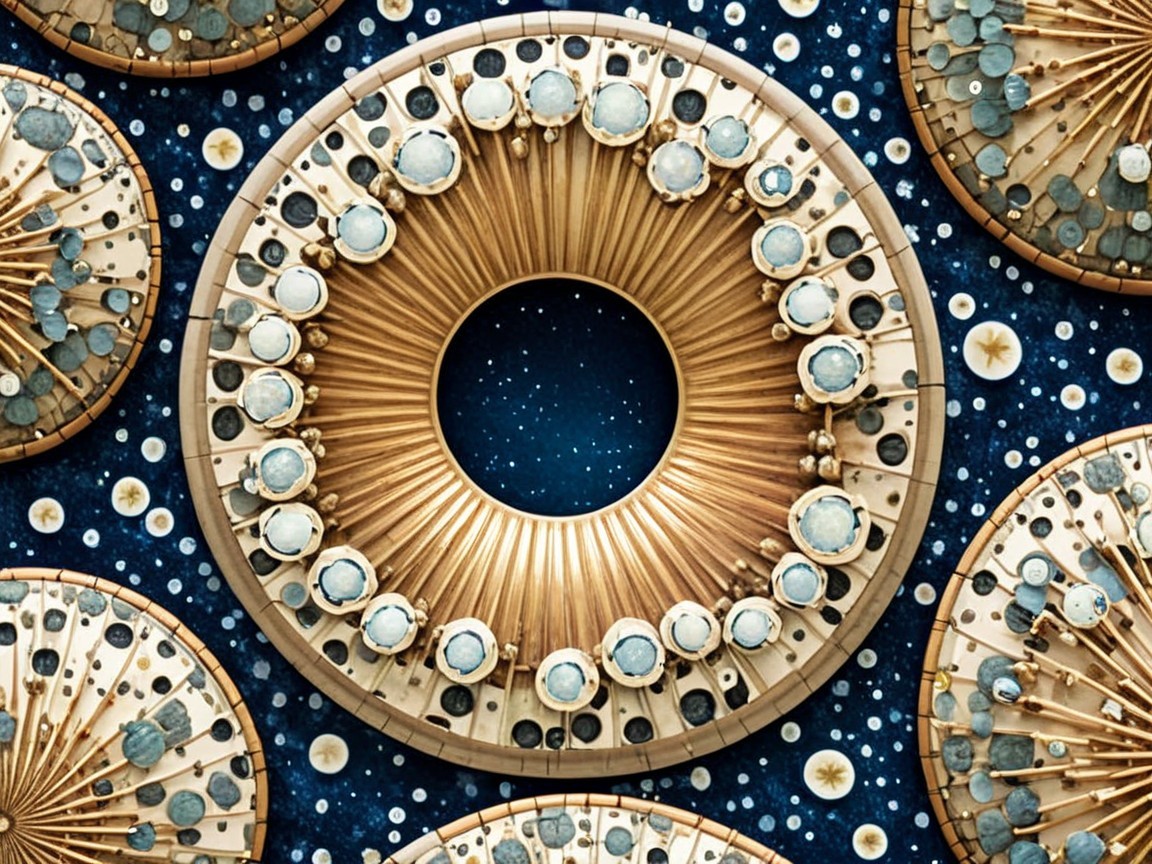A whimsical character in a vibrant, elaborate costume with a top hat and theatrical makeup stands confidently, holding a card. The backdrop features intricate, circular designs in rich colors.