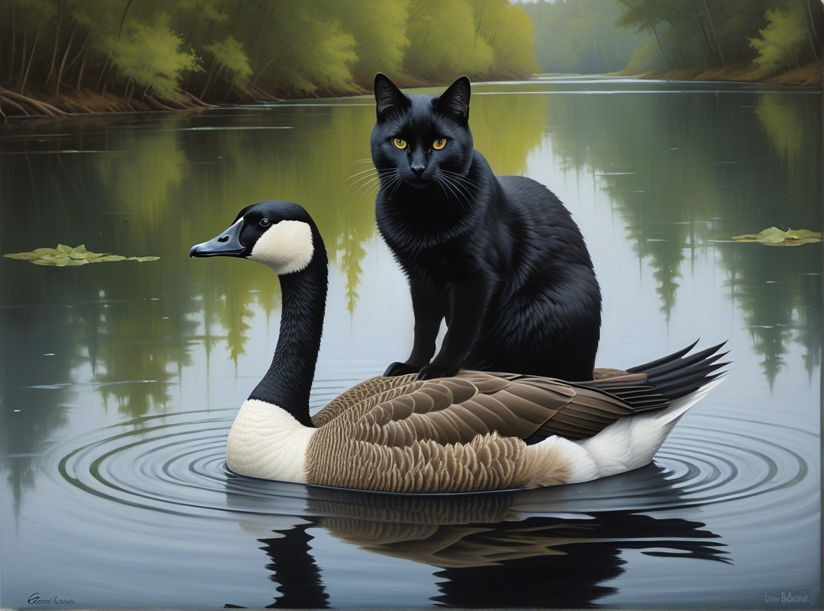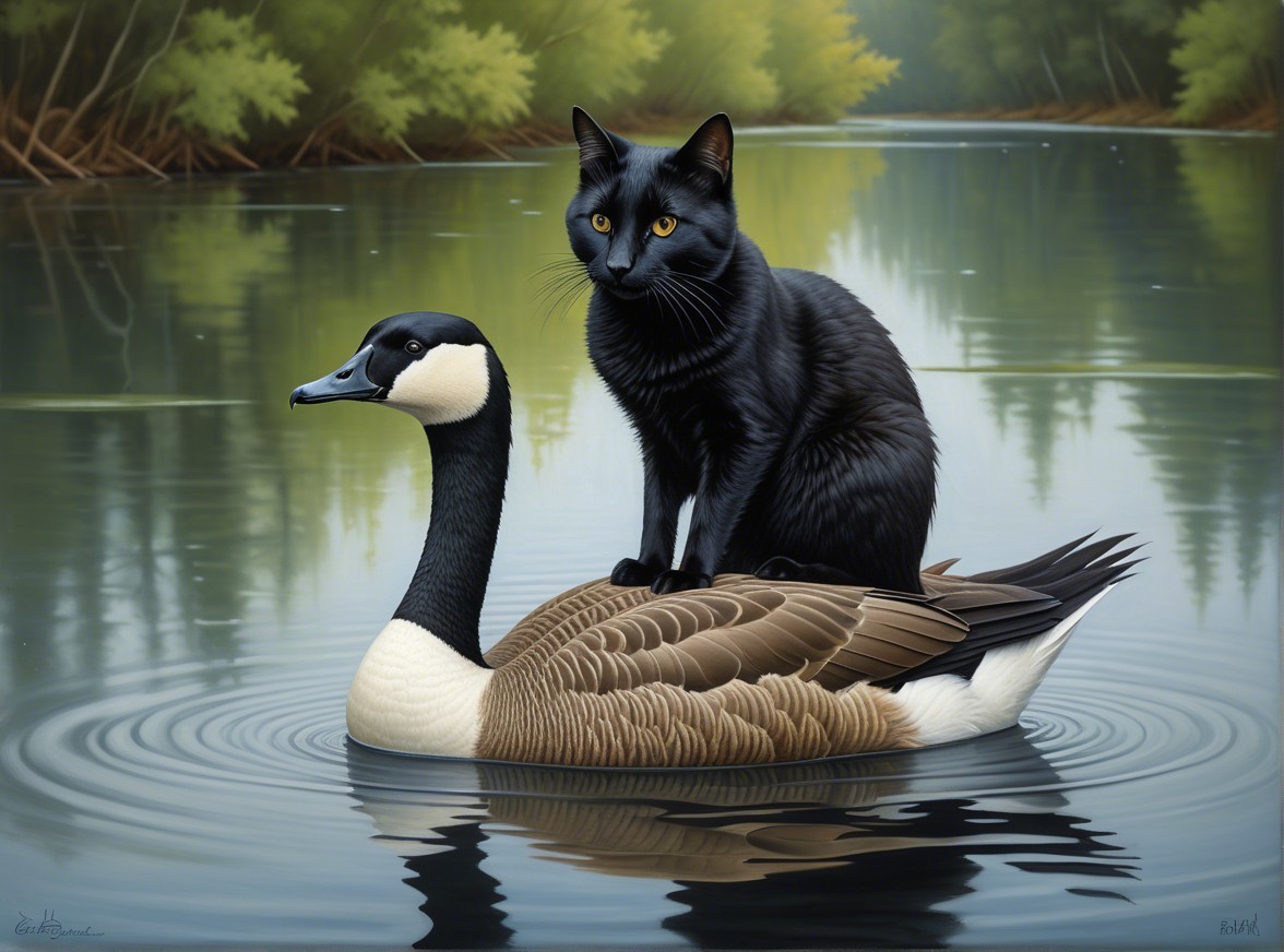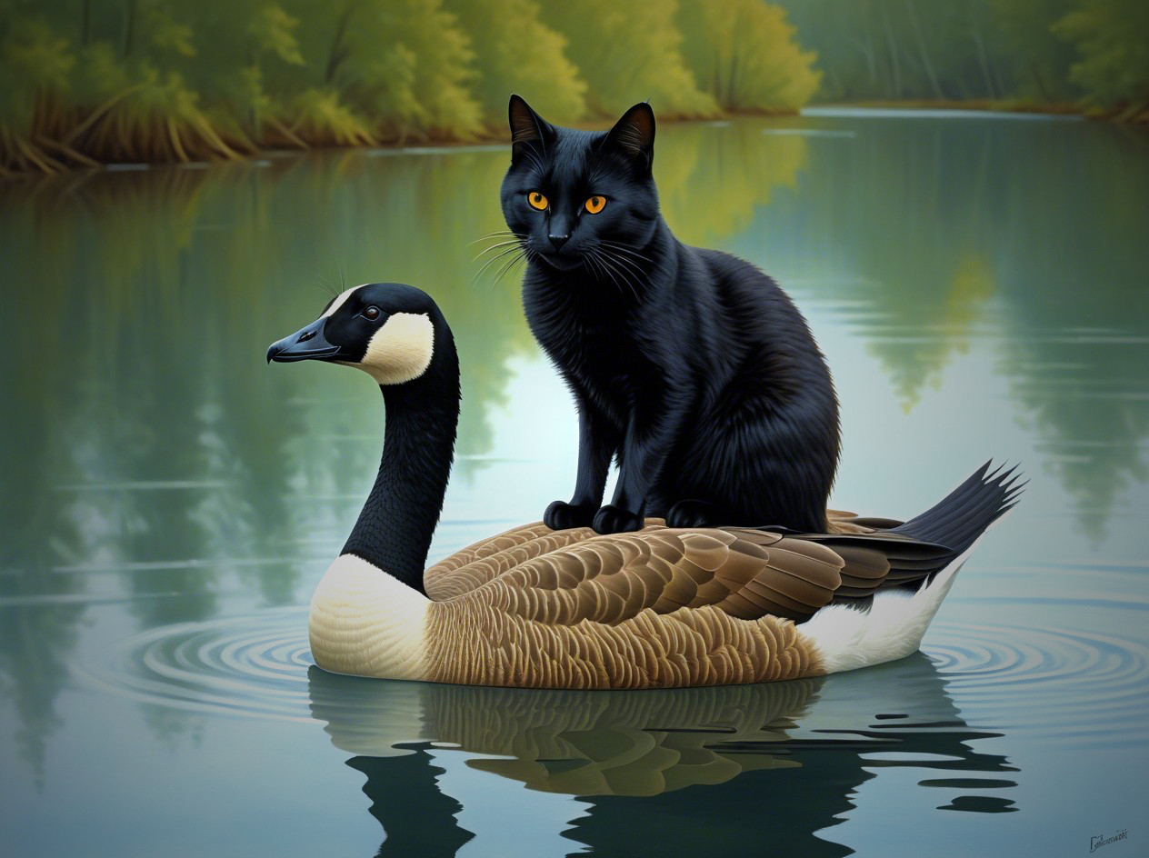 A surreal image featuring a black cat perched on the back of a goose, gliding across a serene river with soft reflections and lush greenery in the background.