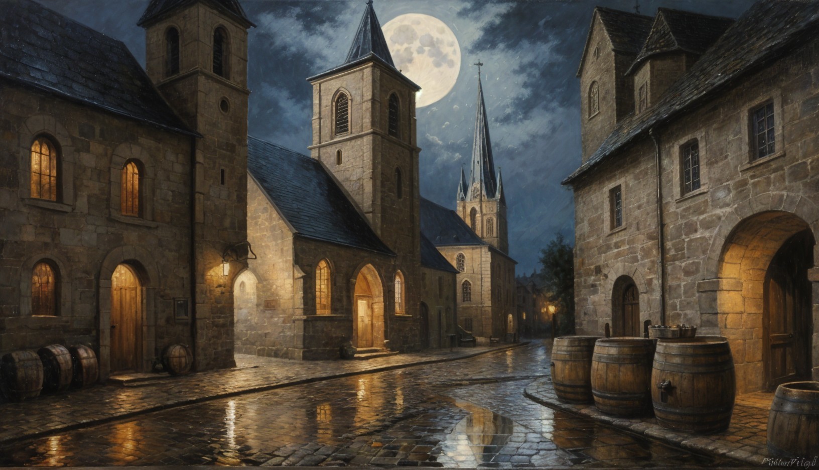 Prompt: a palette knife oil painting of an Illuminated church in the old village center, cobblestones, stone walls, fountain, dark cloudy sky with a full moon, moonlight reflections on the wet cobblestones, wooden barrels, by anton pieck