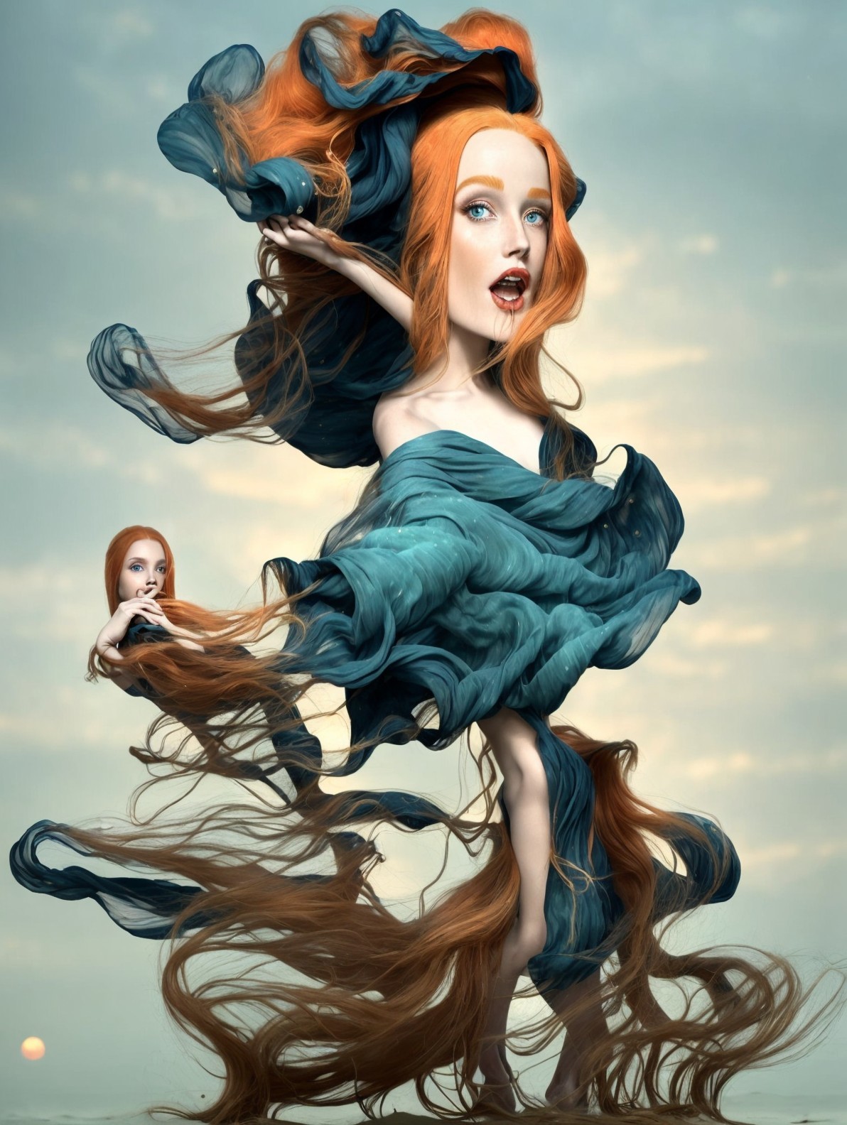 A digital artwork of a woman with flowing red hair and a blue dress, set against a beach backdrop with a clear blue sky.