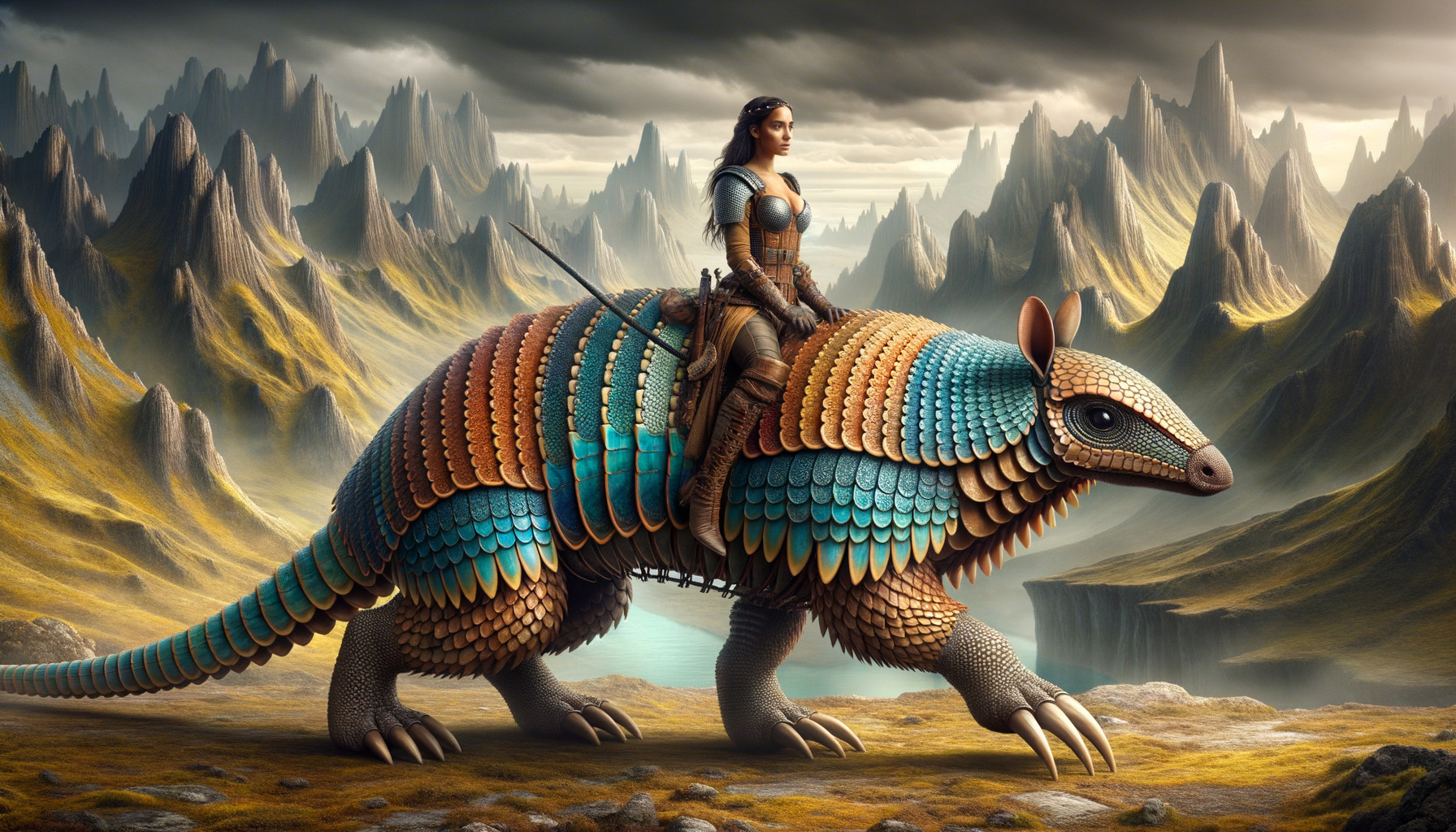 A warrior rides an armored giant armadillo in a majestic fantasy landscape with towering mountains.