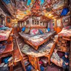 A striking figure in a yellow polka dot dress sits amid whimsical, colorful orbs and intricate, gold-patterned formations, blending fashion with a surreal, dreamlike environment.