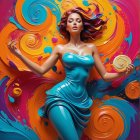 A vibrant, abstract composition featuring a stylized, glossy figure in a blue dress surrounded by swirling colors. Coins are held in each hand, adding a touch of allure to the dynamic scene.
