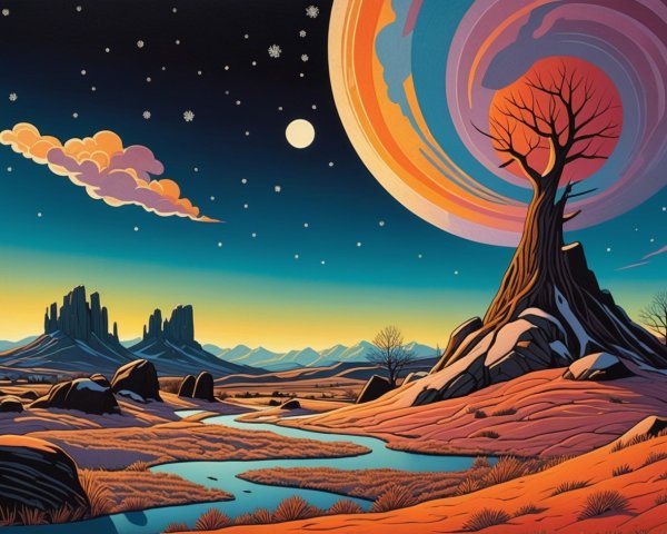 A stunning landscape showcases a deep canyon with towering cliffs, rich greenery, and a meandering river beneath a dynamic sky filled with soft clouds and rays of sunlight piercing through.