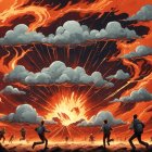 A dramatic scene shows a group of athletes in red and white uniforms running away from a fiery explosion amidst a night sky filled with vibrant bursts and smoke clouds.