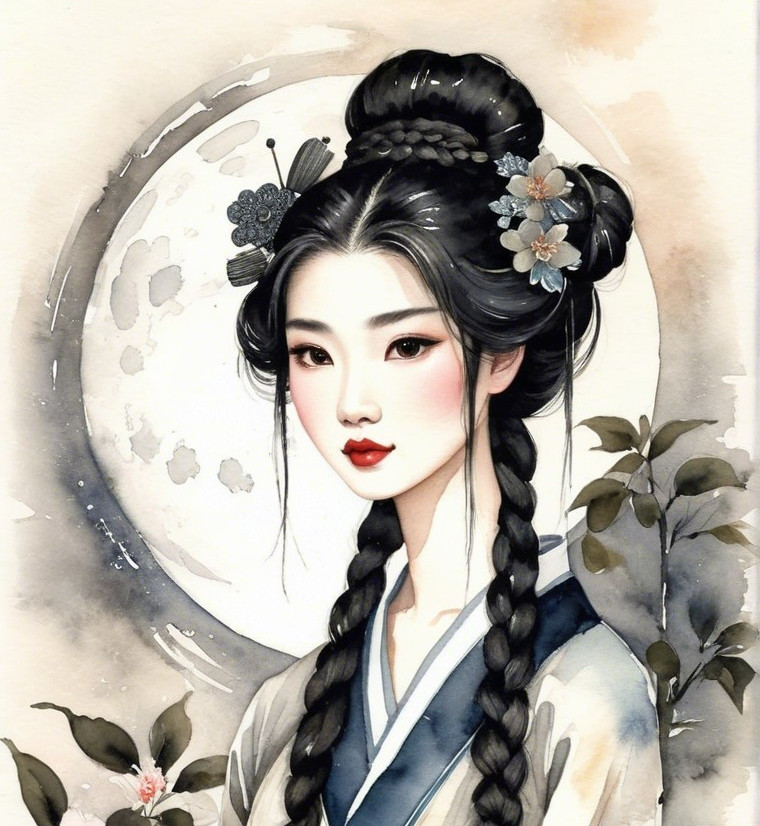 Prompt: "watercolor (((Masterpiece))) wet on wet, soft edges, muted traditional colors. Create an illustration of a chinese female character with a youthful appearance, featuring intricate braided black hair styled in a top bun, almost if woven into an intricate updo, eyes enhanced by a hint of emotion, Chang'e goddess of the moon, waxing cresent moon. traditional floral motifs, Shrink to fit, gorgeous, amazing, stunning. No frame, no artifacts, no words."