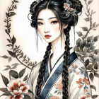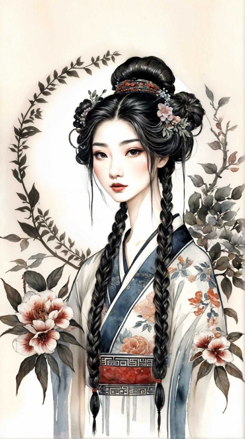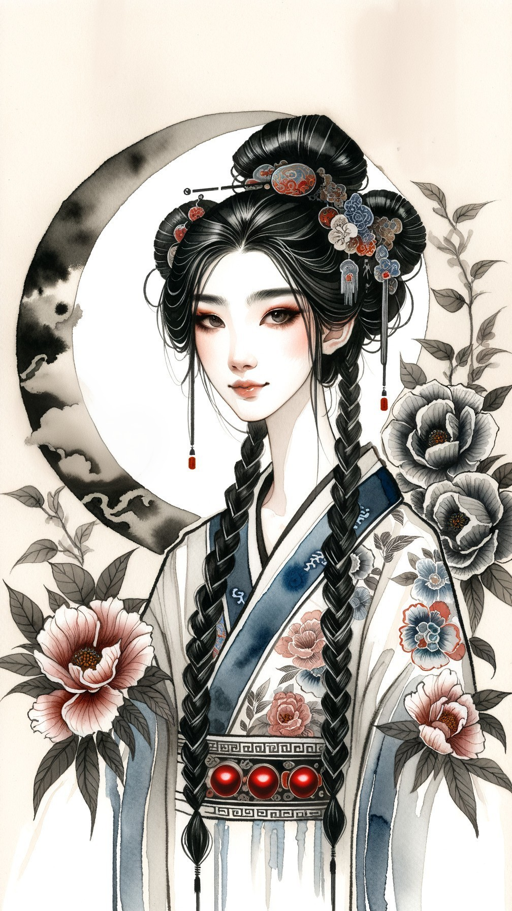 Prompt: even more beautiful, goddess like, glimmer of light in her eyes, Full moon behind her. watercolor (((Masterpiece))) wet on wet, soft edges, muted traditional colors. Create an illustration of a chinese female character with a youthful appearance, featuring intricate braided black hair styled in a top bun, almost if woven into an intricate updo, very full hair in updo, eyes enhanced by a hint of strong emotion, soft brush drawing up creation of time and space. traditional floral motifs, Shrink to fit, gorgeous, amazing, stunning. No frame, no artifacts, no words.