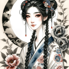 A serene portrait of a young woman with long braids, adorned with flowers in her hair, set against a large full moon. She wears traditional attire and exudes a tranquil, ethereal beauty.