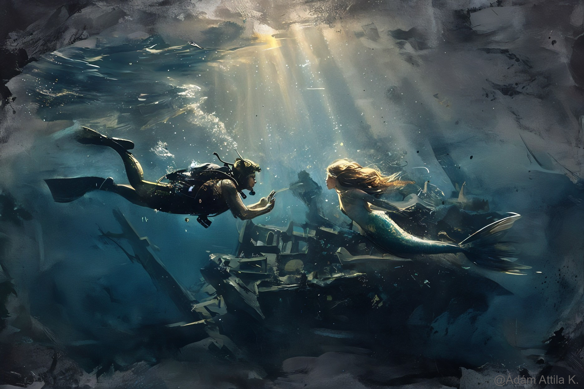 A diver encounters a beautiful mermaid underwater as she swims past a shipwreck. A painterly style digital image of a male diver floating horizontally to the left, wearing a black wetsuit, gray scuba tank, and black fins, looking at a female mermaid with long blonde hair and a light upper body, floating horizontally toward the water.