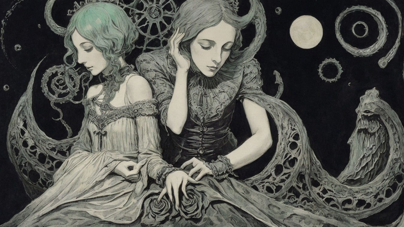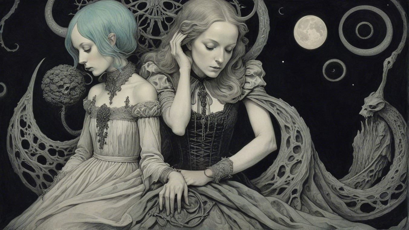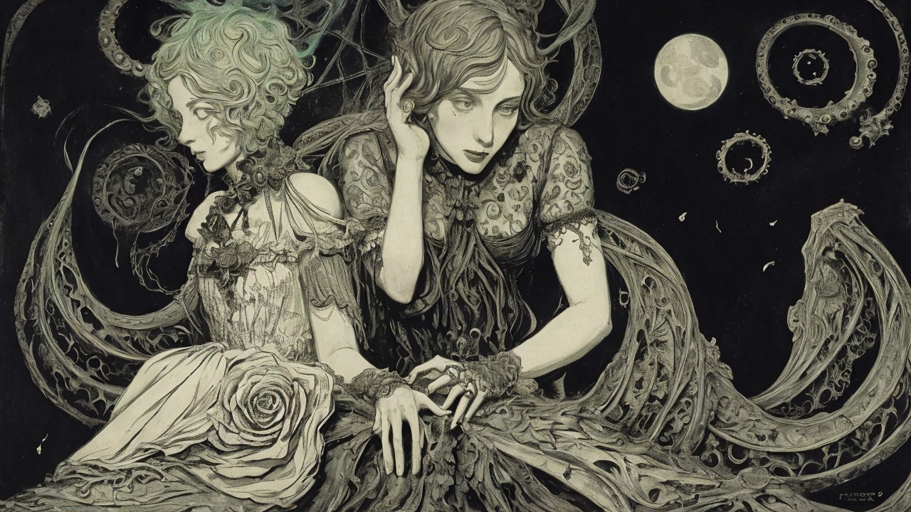 In the style of Felicien Rops, William Blake, Jakub Schikaneder and Jacek Yerka. Ensure all significant elements are fully within the boundaries.