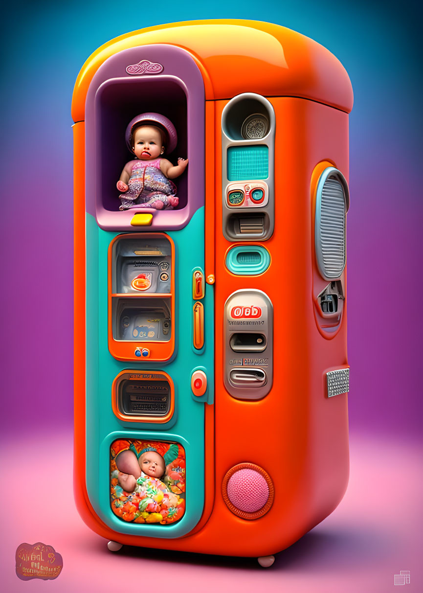 Colorful Baby in Fantastical Toy Vending Machine on Purple Background