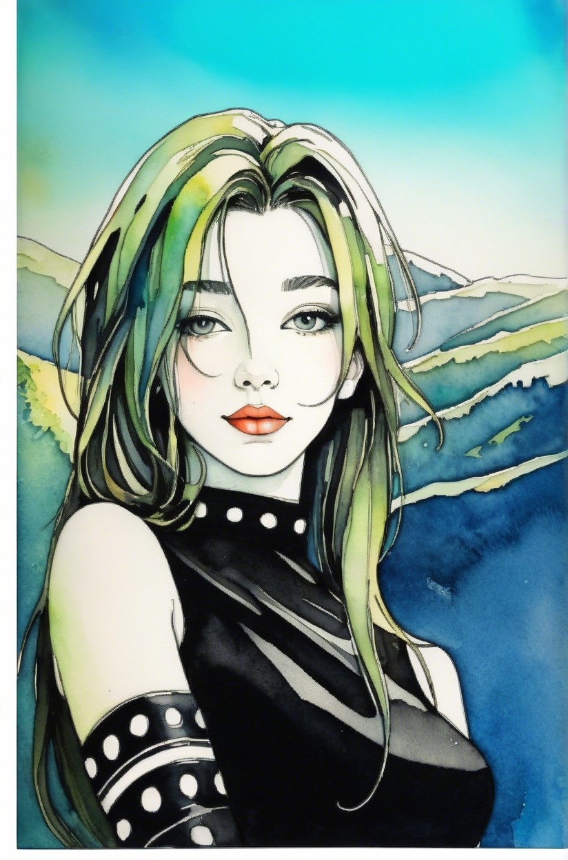 A striking illustration of a young woman with long, green-tinted hair and subtle features, wearing a black outfit with polka dot accents. The background features serene blue and green mountains.