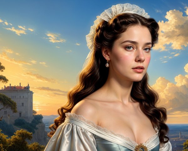 A young woman with long, wavy hair adorned with a red rose gazes softly at the viewer, holding another rose. The serene landscape behind her features lush greenery and flowing water.
