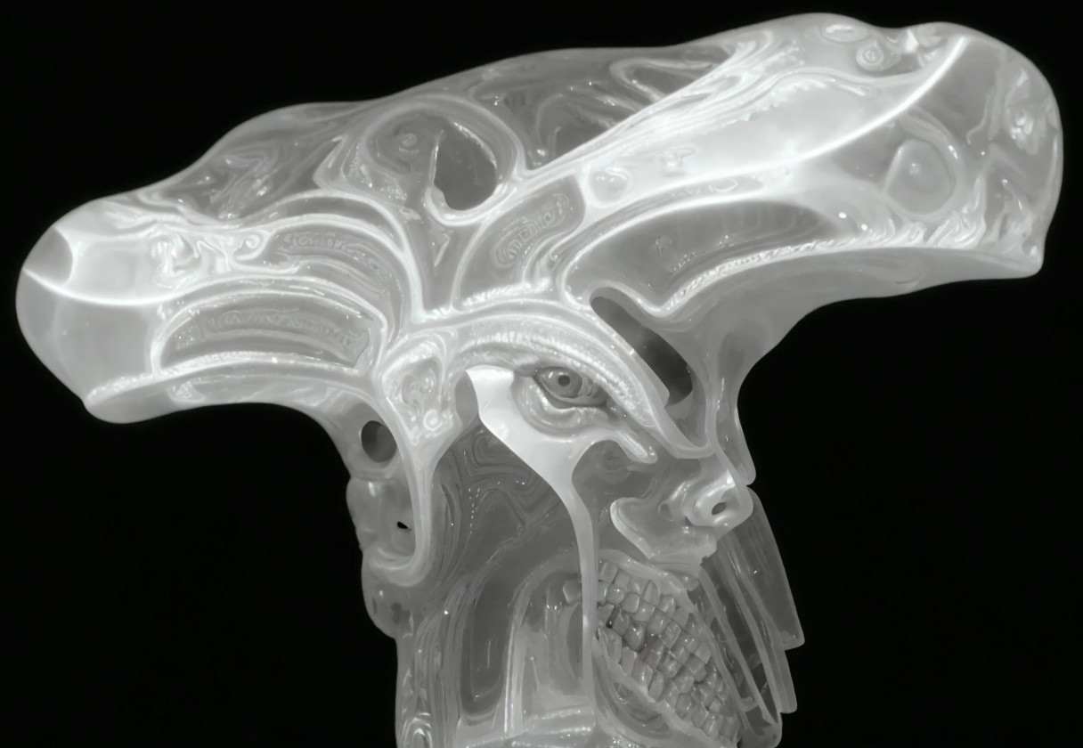 A monochromatic image of a skull with intricate etched patterns, likely representing an artistic or cultural artifact.