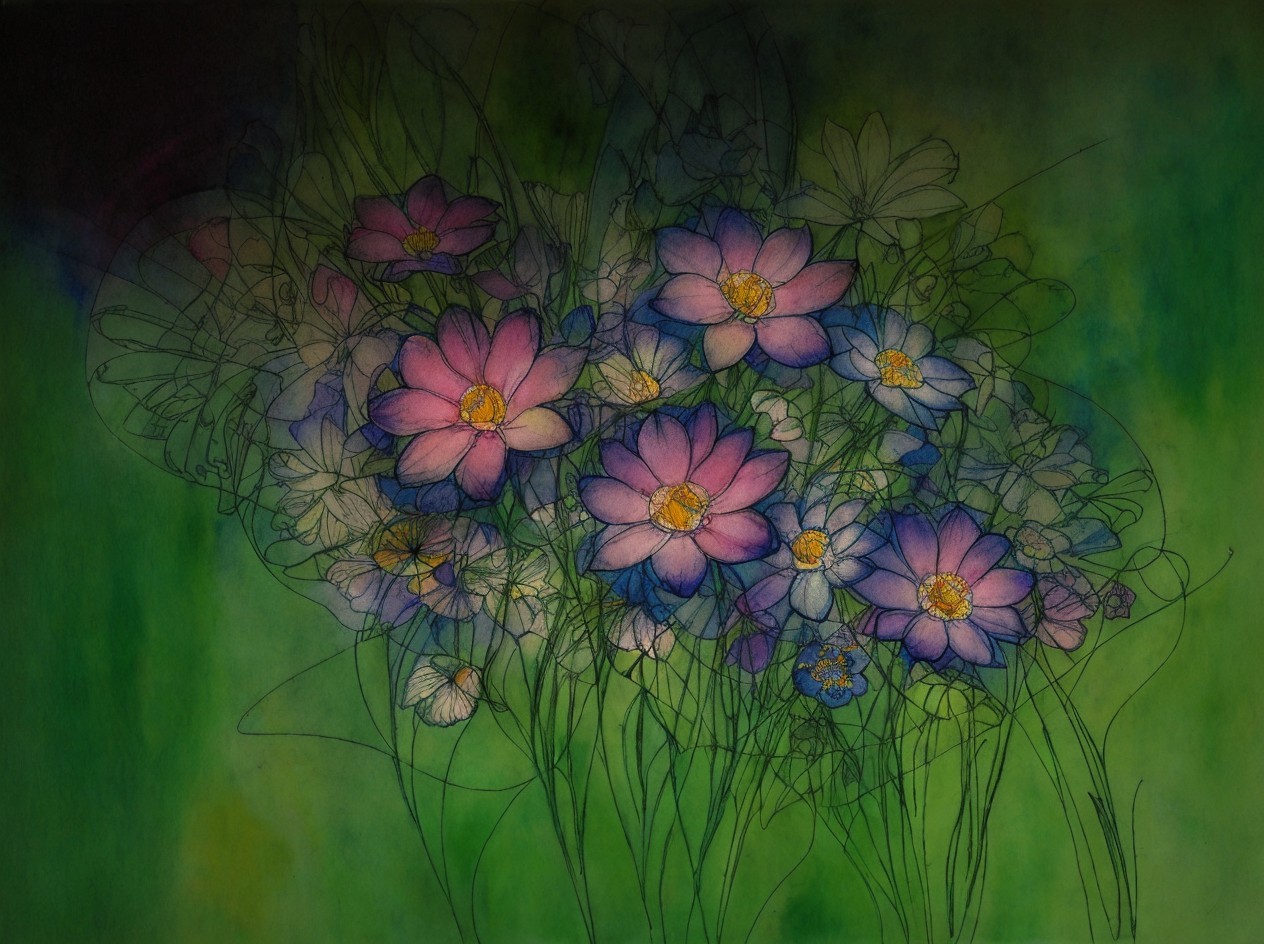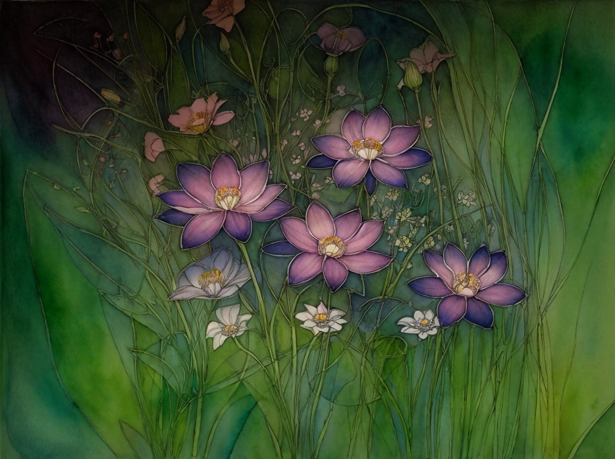 made from a fractal by Lilly. A serene painting of pink and white lotus flowers amidst tall green reeds, with a soft, dark watercolor background.