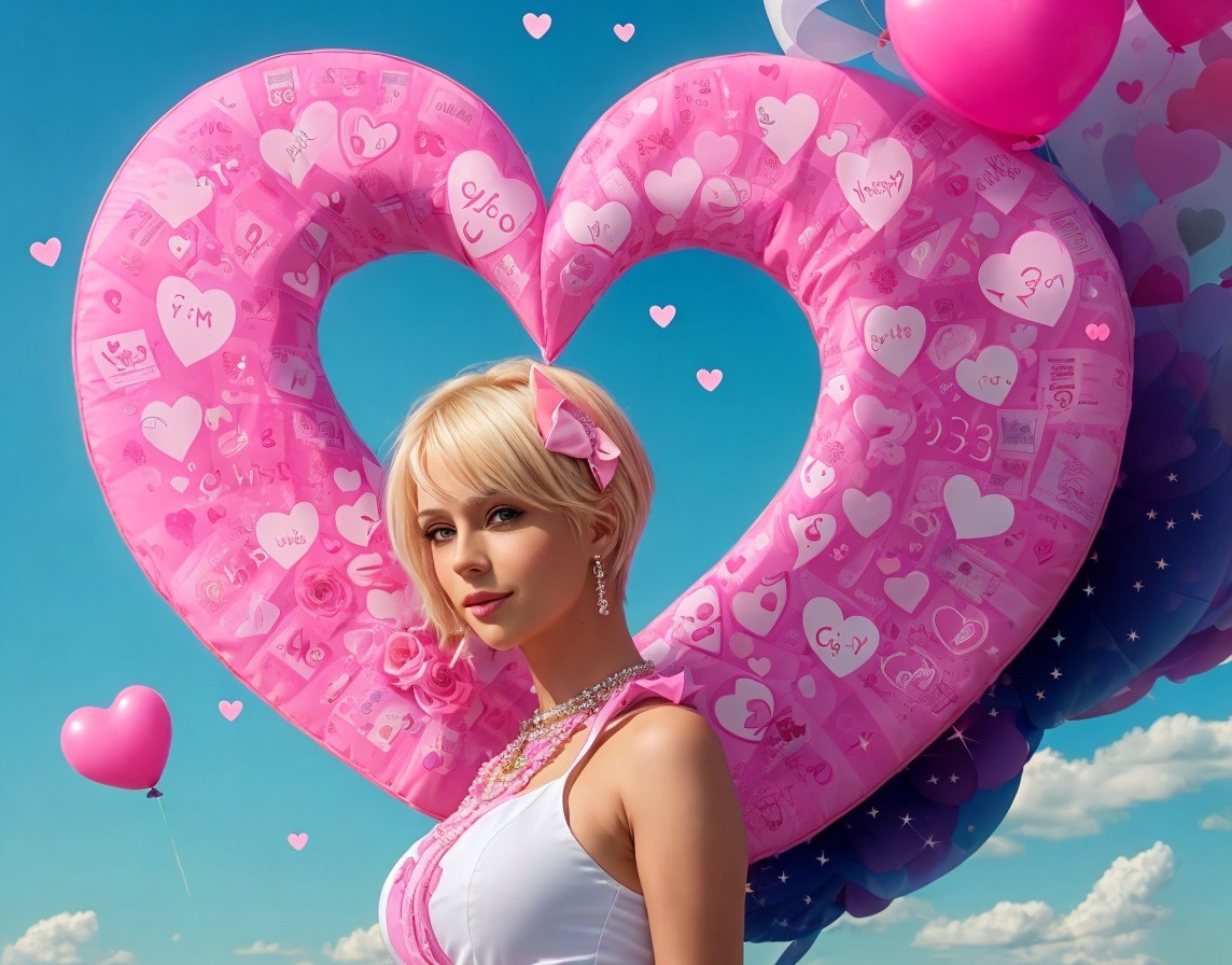 Prompt: Text: Happy Birthday - Picture: A woman drawn entirely using cats and love symbols, full body, arms stretched towards the sky, pink hearts, she is beautiful and clever, short blonde hair, greek letters, algebra, numbers, codes, digits, logical and arithmetic operations, integrals and derivatives, cats & love & pink everywhere
