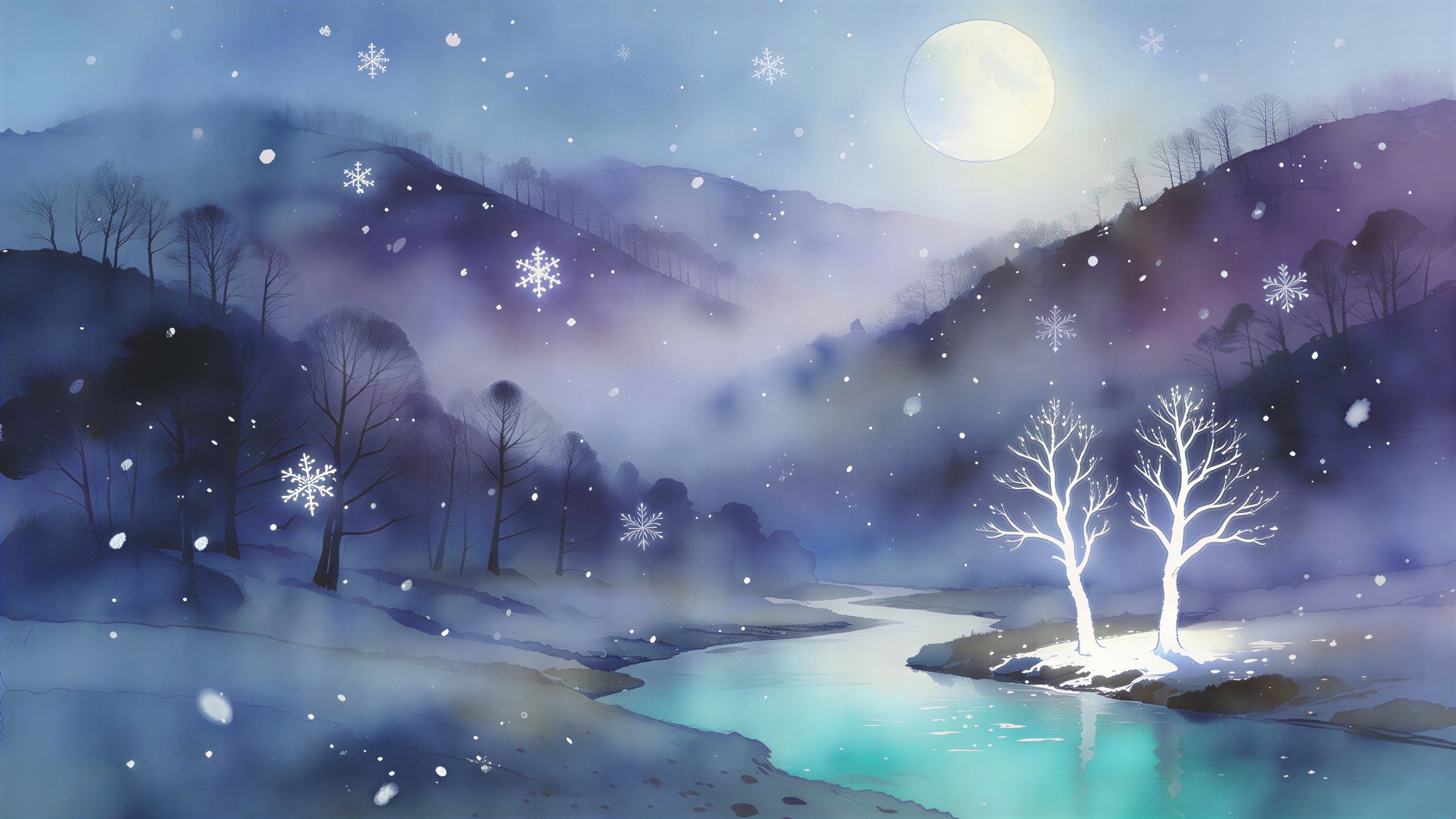 A dreamlike watercolor illustration of a winter landscape at night, featuring a winding river of luminous turquoise water reflecting the glow of two ghostly white trees on its bank, bathed in moonlight, with snowflakes falling and larger ornate snowflakes scattered throughout the scene, set against misty indigo and purple mountains silhouetted by scattered