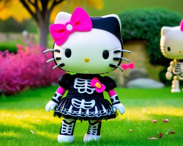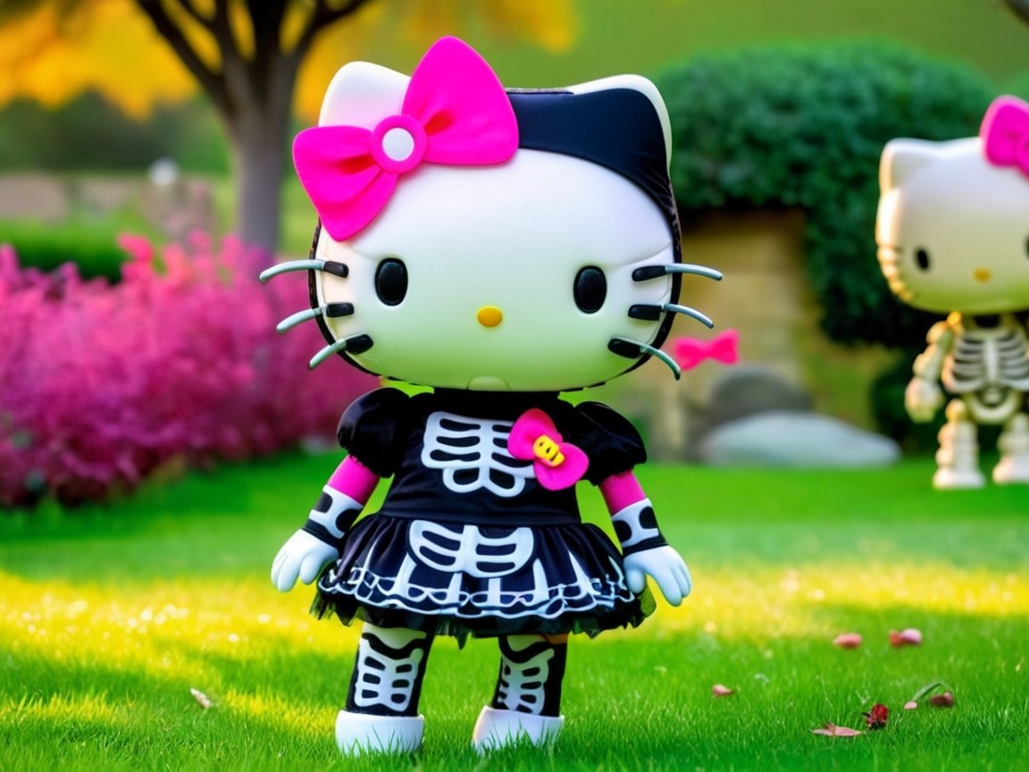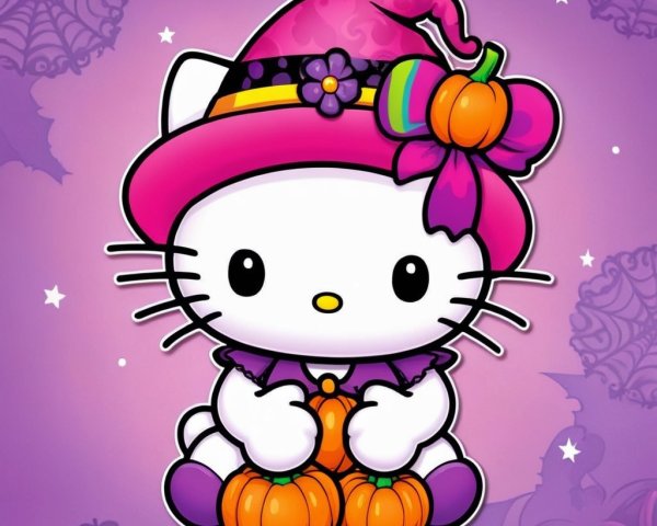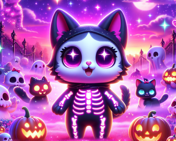 A vibrant Halloween scene features a cute, skeleton-costumed cat with big eyes, surrounded by smiling jack-o'-lanterns and whimsical monster creatures under a starry night sky.
